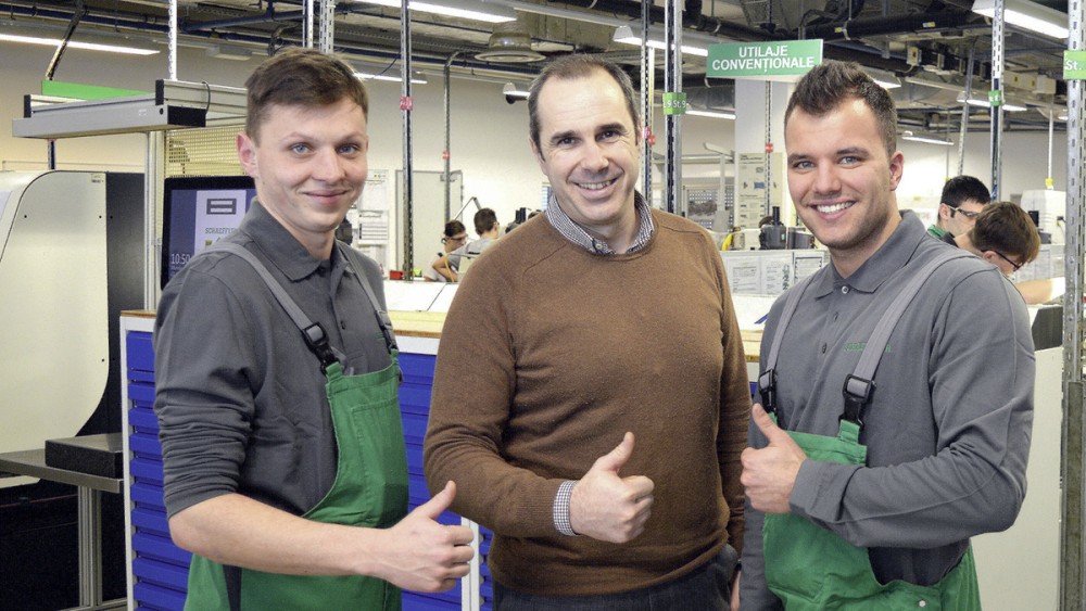 Praktikumsstart im rumänischen Brasov: v.l.n.r. Jonas Rosenthal, Praktikant, Uwe Kando, Leiter Training Center Schaeffler Brasov, Till Hake, Praktikant.