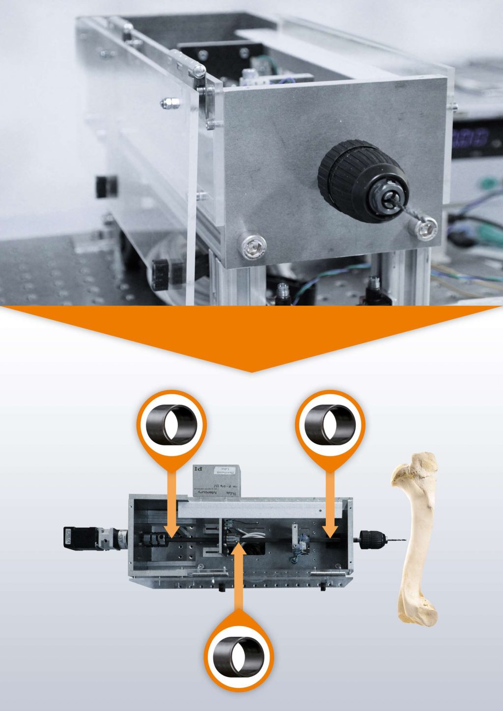 The special requirements of the medical drilling machine were to develop an optimal bearing in different speed and vibration frequency ranges without a negative influence on the system. “The combination of rotary drive and axial vibration requires the use of high-quality plain bearings not only to implement freedom of movement in the axial direction, but also to achieve the most accurate signals possible at high vibration frequencies,” explained Michael Sorg of BIMAQ. To cover all requirements, various igus plain bearings were compared with iglidur L500 selected as the best option.